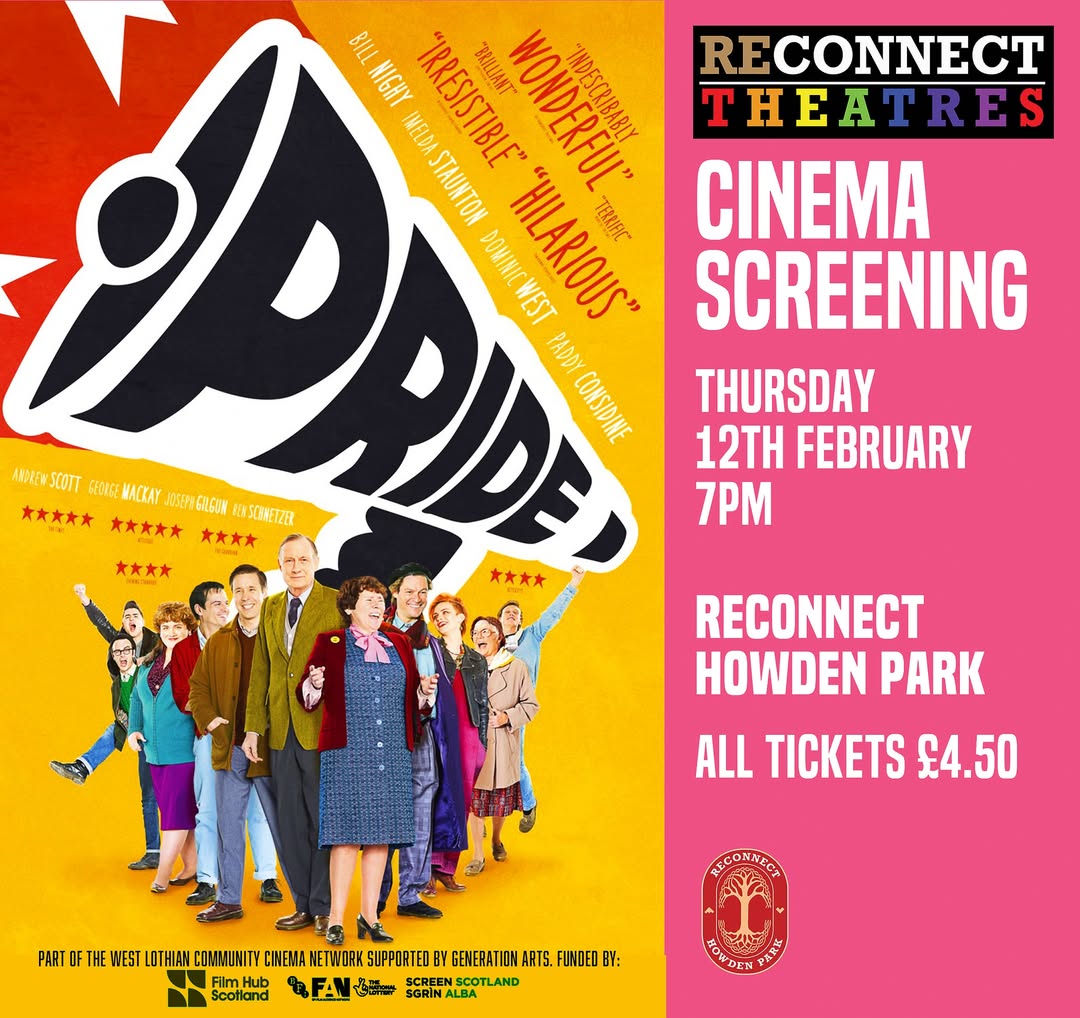 PRIDE is inspired by an extraordinary true story. It's the summer of 1984, Margaret Thatcher is in power and the National Union of Mineworkers is on strike, prompting a London-based group of gay and lesbian activists to raise money to support the strikers' families. Initially rebuffed by the Union, the group identifies a tiny mining village in Wales and sets off to make their donation in person. As the strike drags on, the two groups discover that standing together makes for the strongest union of all..Come and celebrate LGBT+ History month with us at Reconnect Howden Park in partnership with West Lothian Pride.